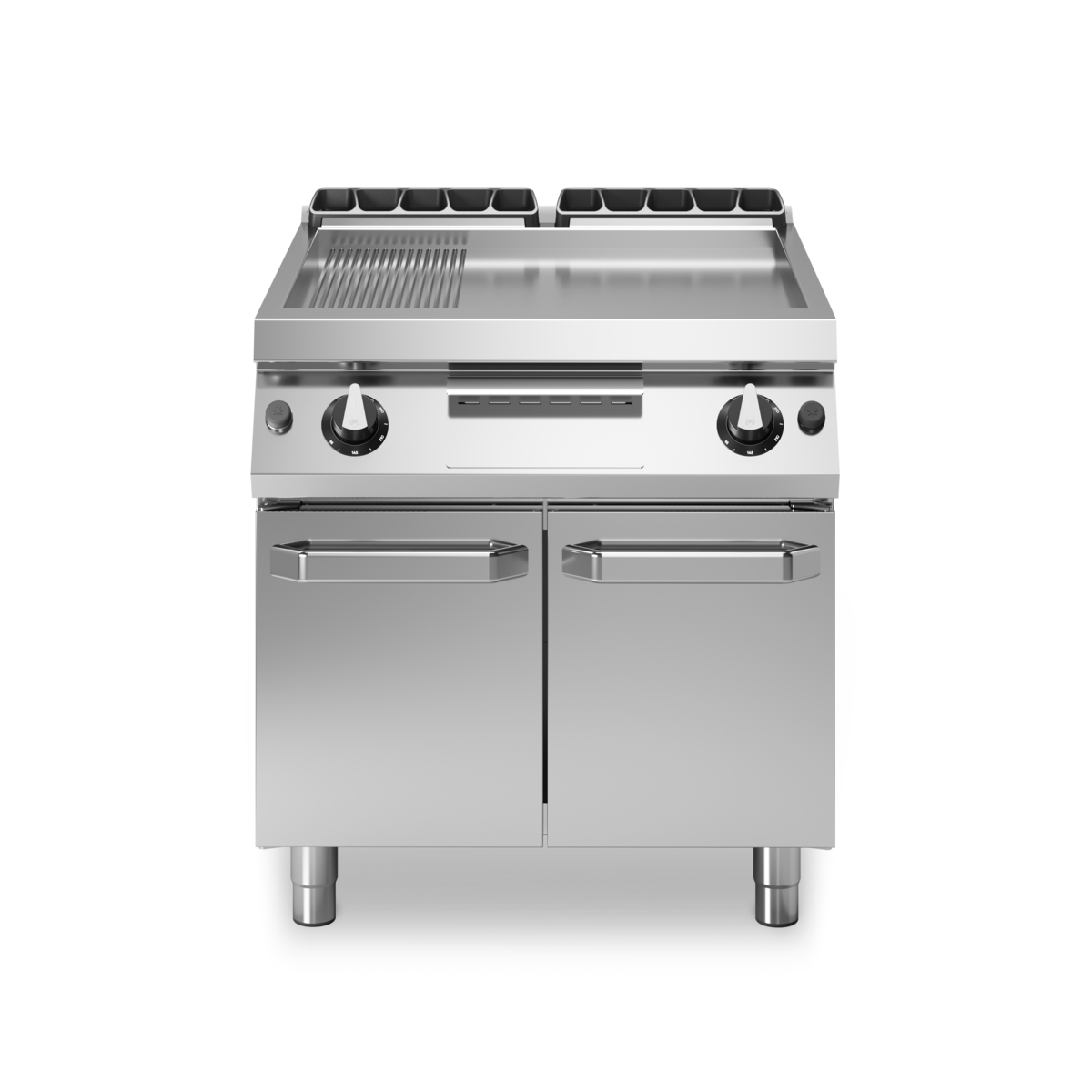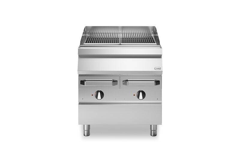 Struttura da banco in acciaio inox con alette para schizzi sui tre lati, per una cottura in sicurezza. La griglia in ghisa è dotata di 2 zone di cottura indipendenti, ognuna regolata dal proprio termostato, con manici in plastica termoisolante che permettono di poterle agevolmente spostare e/o posizionare. Al di sotto delle griglie in ghisa è posizionata la […]