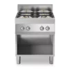 Cucina a gas con piano stampato realizzato in acciaio inox AISI 304 con spessore 10/10 mm, bacinelle smaltate estraibili. Bruciatori in ghisa con spartifiamma in ottone monocorona e doppia corona con pilota