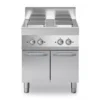 Cucina elettrica con piano realizzato in acciaio inox AISI 304 con spessore 10/10 mm e invaso per la raccolta dei liquidi. Piastre quadre in ghisa cm 22×22.