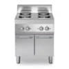 Cucina elettrica con piano realizzato in acciaio inox AISI 304 con spessore 10/10 mm e invaso per la raccolta dei liquidi. Piastre tonde in ghisa cm Ø 22.