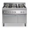 Cucina a gas con piano stampato realizzato in acciaio inox AISI 304 con spessore 10/10 mm, bacinelle smaltate estraibili. Bruciatori in ghisa con spartifiamma in ottone monocorona e doppia corona con pilota.