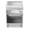 Fry top con piastra rivestita in cromo duro lucidato a specchio inclinata per favorire il deflusso dei liquidi. Riscaldamento con rubinetto di sicurezza dotato di valvola termostata.