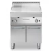 Fry top con piastra rivestita in cromo duro lucidato a specchio inclinata per favorire il deflusso dei liquidi. Riscaldamento con rubinetto di sicurezza dotato di valvola termostata.