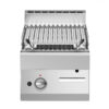 Griglia a pietra lavica con griglia in acciaio inox con cassetto raccolta liquidi e alzatine paraspruzzi su 3 lati.
