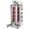 Macchina per cuocere carne per Kebab – struttura, asta spiedo e paletta raccogli carne in acciaio inox – resistenze ad infrarossi rivestite in ceramica – vetro di protezione resistente alle alte temperature che ne facilita la pulizia e abbassa i consumi – regolazione resistenze a settori – regolazione distanza asta spiedo dalle resistenze – cassetto di raccolta residui di cottura in acciaio inox.