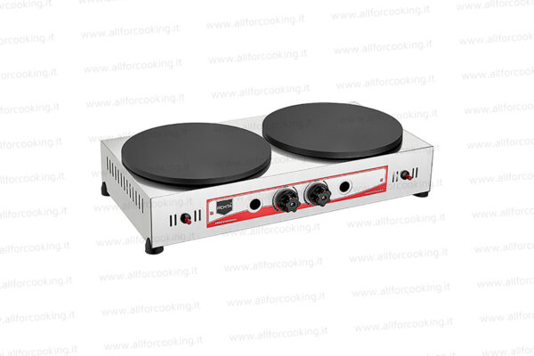 Doppia piastra professionale per crepes. Adatta ad un uso professionale e prolungato, per bar, ristoranti e street food. Struttura in acciaio inox, piano cottura in ghisa teflonata con superficie multi righe antiaderente, alimentazione a GLP o gas metano (kit su richiesta), manopole di regolazione potenza, accensione con piezoelettrici. Dopo la cottura è semplice rimuovere le crepes dalle piastre anti-aderenti.