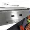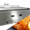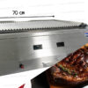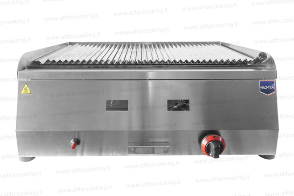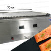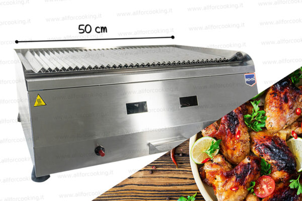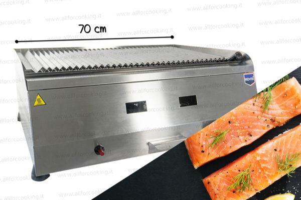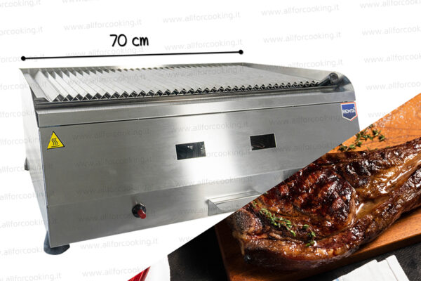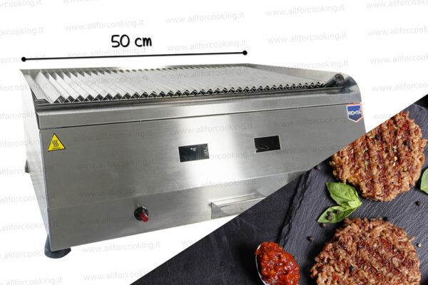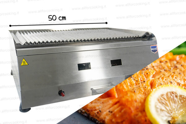 Il fry top a gas con pietra lavica è costituito da una robusta struttura esterna in acciaio INOX e una piastra singola di dimensioni di 50 cm. La griglia di cottura in lamiere piegate a V in acciaio inox permette un’ottima cottura della carne e del pesce.