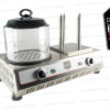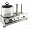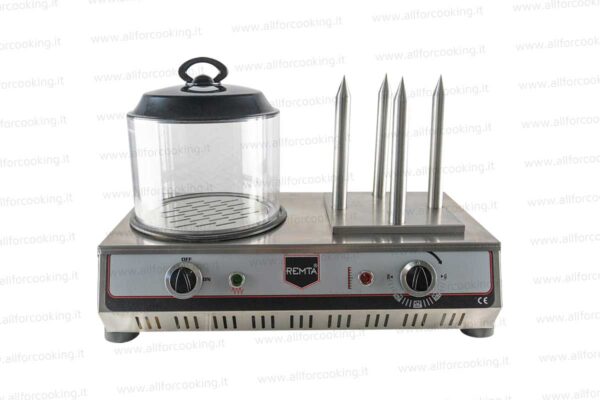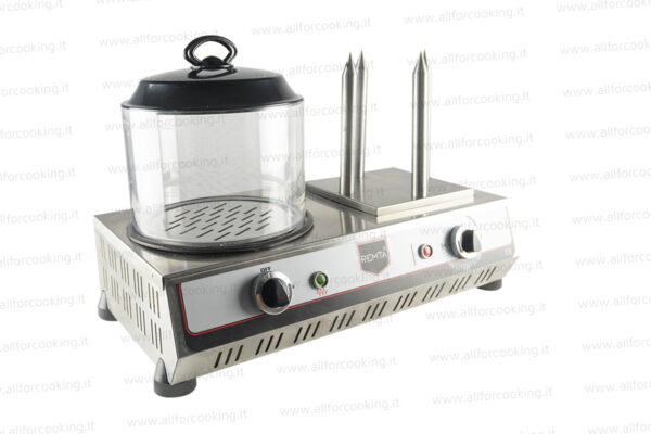 La struttura è in acciaio inox. Una campana in vetro con all’interno un cestello in inox rotante permette una cottura dei würstel a bagno maria. Sul lato opposto sono presenti 4 sticks (punzoni) riscaldati che permettono di riscaldare e tostare il pane.