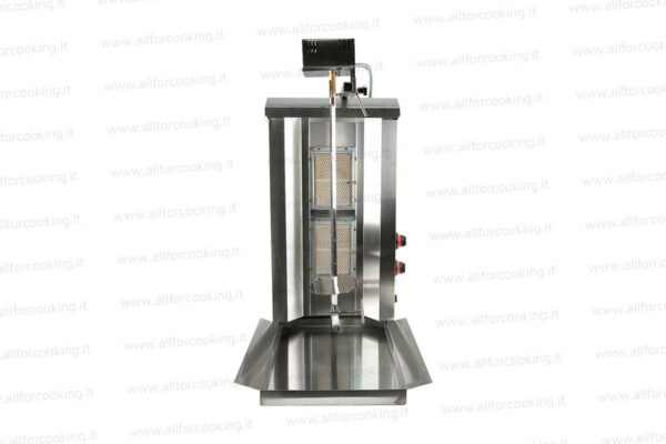 Macchinario ad uso professionale, indispensabile per cuocere la carne per kebab e Caciobab. La struttura esterna, l’asta e lo spiedo (regolabile) sono realizzati in acciaio inox, così come il cassetto di raccolta per i residui di cottura.