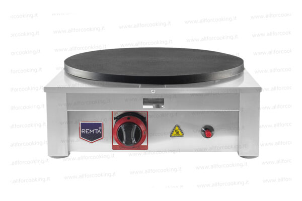 Piastra professionale per crepes. Adatta ad un uso professionale e prolungato, per bar, ristoranti e street food. Struttura in acciaio inox, piano cottura in ghisa teflonata (40 cm) con superficie multi righe antiaderente, alimentazione a GLP o gas metano (kit su richiesta), manopole di regolazione potenza, accensione con piezoelettrici. Dopo la cottura è semplice rimuovere le crepes dalle piastre anti-aderenti.