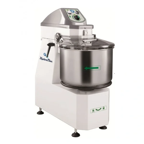 Impastatrice a spirale “Hydraplus” con pannello comandi meccanico, testa sollevabile e vasca estraibile. Macchina per realizzare diversi tipi di impasto, indicata soprattutto per impasti ad alta idratazione fino al 90%. Struttura rivestita con vernice antigraffio – parti a contatto con gli alimenti quali vasca, spirale ed asta spacca pasta sono in acciaio inox – microinterruttore di sicurezza su coperchio vasca – coperchio in policarbonato fumè di serie. Vari optional a richiesta, tra cui coperchio grigliato in acciaio inox AISI 304 Specifiche tecniche Motore Brushless con inverter Potenza 2,4 kW ( 3,2 HP) Alimentazione 220-240V/1N/50-60Hz Produzione oraria 36kg/h Capacità impasto 12kg Capacità vasca 16 L Dimensioni vasca ø 320×210(h) mm Velocità ( rpm ) 55÷ 250 Dimensioni 632x320x750/932(h) mm