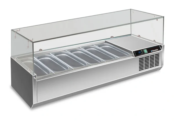 Vetrina refrigerata porta-condimenti con sovrastruttura in vetroVaschette Gastronorm N° 6 GN1/3 (non incluse)Temperatura +2 °C / +8 °CSuperficie esterna in acciaio Inox AISI 304Superficie interna in acciaio Inox AISI 304Termostato elettronicoRumorosità 40 dB Smart Link WiFiSbrinamento manualePeso Kg 31Voltaggio V 220-240Refrigerante R600AAssorbimento W 110 Consumo energetico Kw/24H 1,2Dimensioni esterne (LxPxH) 1500 x 395 x 435 mm
